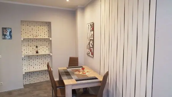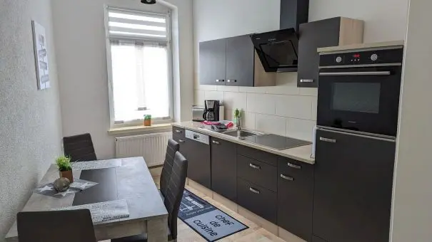 Das Herzstück der Wohnung ist die großzügig gestaltete und komplett eingerichtete Einbauküche. Hier finden Sie alles, was Sie für die Selbstversorgung benötigen, sowie gemütliche Sitzgelegenheiten, die nicht nur zum Essen, sondern auch zum gemeinsamen Verweilen einladen. Das freundliche Badezimmer ist sowohl mit einer Badewanne als auch mit einer Dusche ausgestattet – perfekt, um den Tag entspannt ausklingen zu lassen.